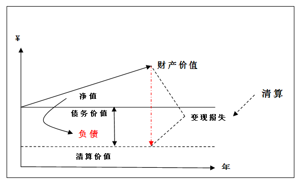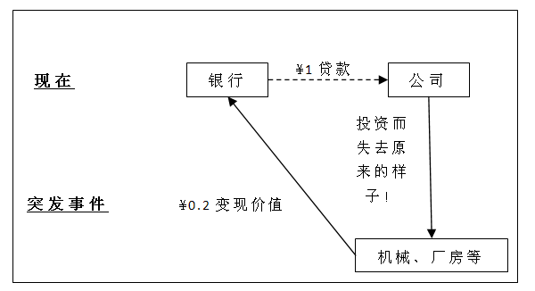 客户和银行往往都没有考虑万一在遭遇不幸如残疾和死亡时的解决方法。银行往往被迫得走查封、拍卖抵押品的下策,结果是客户失去一切而破产,而银行因所借出去的金钱已“变形”成“变现价值”很低的厂房、机械、土地等。每一块钱购买的资产,在没有办法继续经营的情况下,往往只有几角钱的变现价值(以图4-4)。而银行没有办法把贷款完全收回,最终会影响银行的盈余,以及承办人的业绩表现和往后升迁的机会,客户和银行最终都遭遇很大的无谓损失。