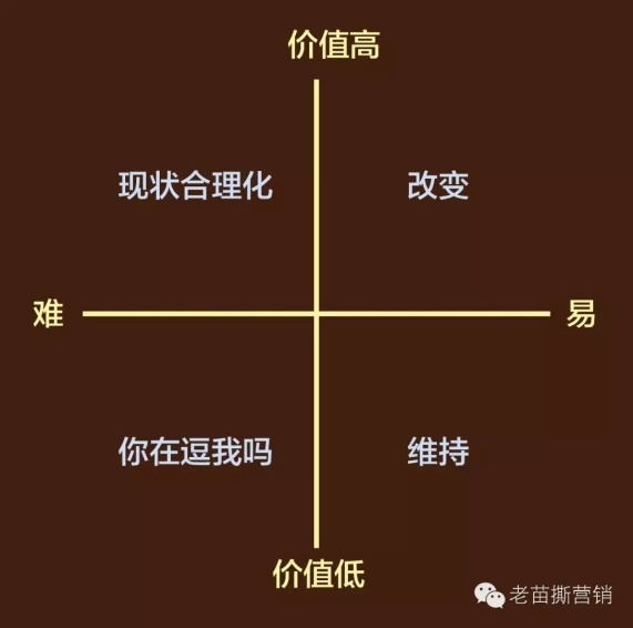 只有觉得改变价值高且很容易改变,人们才会去做,如果改变的价值高而实现起来很难,人们会倾向于把现状合理化而拒绝改变。