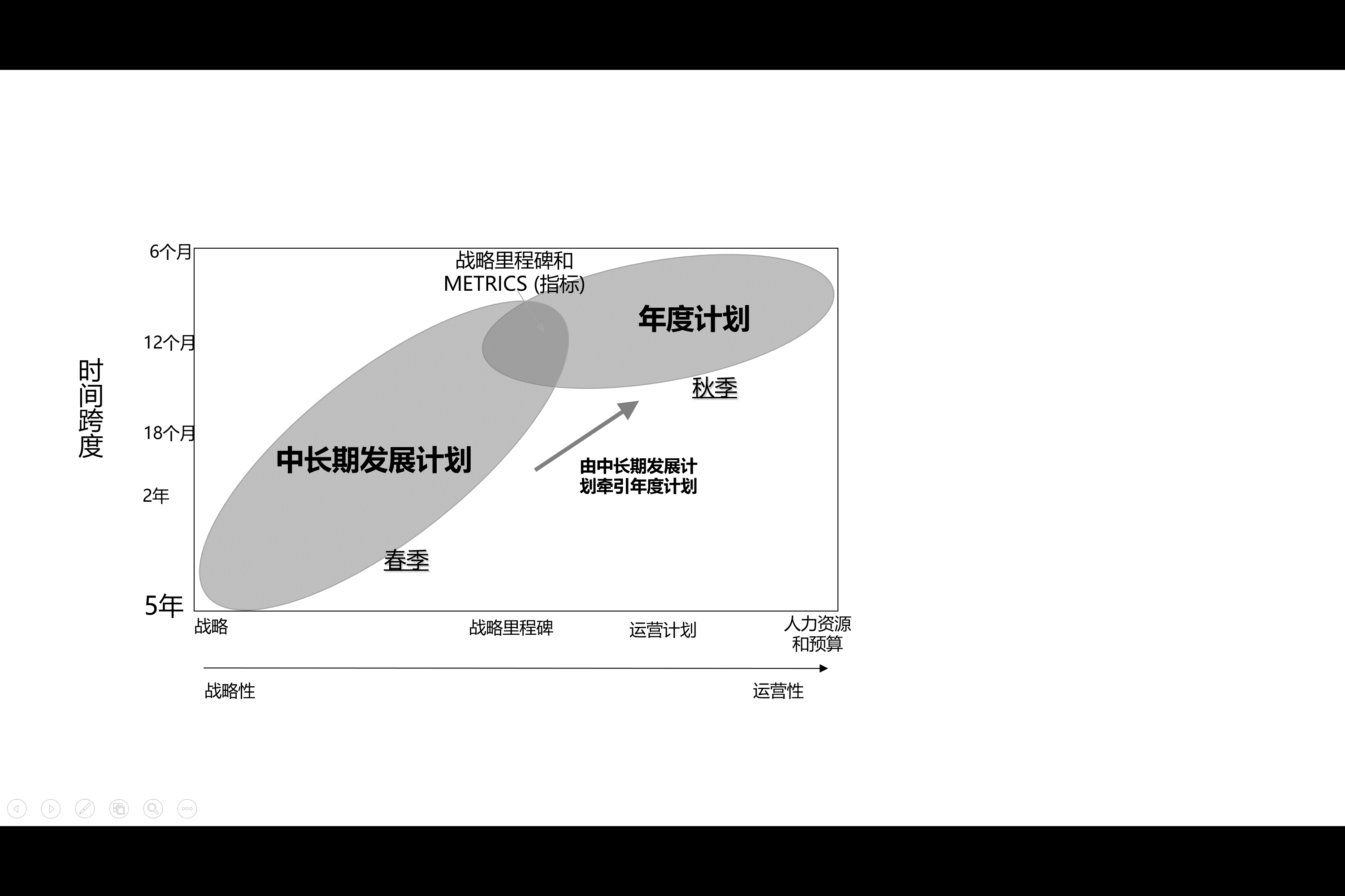不同的公司根据其实际需要和资源投入,采取具有差异化的方式去执行。比如华为公司的规划工作由战略规划和年度商业计划两部分构成。其中,战略规划又称为春季规划,是未来3~5年的规划;年度商业计划又称为秋季规划,是1年的规划,主要是年度商业计划和预算。战略规划指导年度商业计划,年度商业计划驱动全面预算。这个过程将卷入公司大量部门和资源,它不仅是一个规划的过程,同时也是一个公司上下对规划达成共识的过程。如图3-32所示。