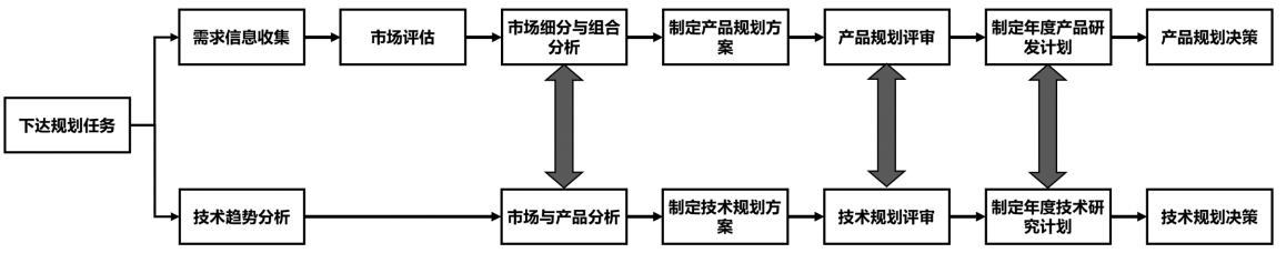 该公司成立两个团队分别负责产品规划和技术规划,在充分沟通的基础上输出各自的规划成果。整个规划过程中,在“产品分析”“内部规划评审”和“制定年度计划”三个活动上面,两个团队进行充分沟通和匹配,以确保产品与技术像“拧麻花”一样紧密结合。