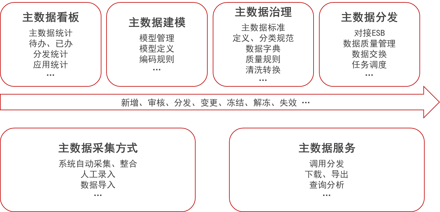 主数据管理的主要工作内容包括:筹建主数据工作项目团队,确定主数据的项目目标和范围,制定主数据管理的相关项目计划;制定主数据标准体系,如数据标准、管理标准、服务标准等,之后基于这些标准对存量的主数据进行收集、清洗、整合,发布标准化的主数据信息;进行主数据管理平台建设,在平台上管理主数据模型,实现主数据的创建、变更、审核等基本内容运维功能,同时构建需对外提供的主数据变更、订阅、查询、同步、分发、通知等核心的技术服务;将主数据标准与现行业务融合,推动相应的业务流程变更,同时,将各业务系统与主数据管理平台进行集中对接,最终实现主数据在多个系统之间的共享和统一,为主数据的长效治理提供基础保障。
