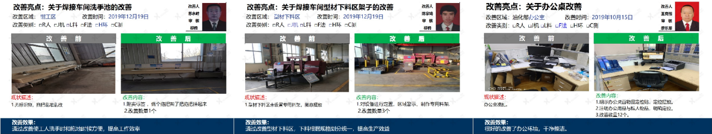 通过系统打造、持续改善,现场制作亮点239个,一般改善提案3739件,重点提案241件,提案有形效果金额330万元,可视化标准86项目,各生产线共进行了10处主题性的现场两源改善,如CNC2000车间减少油雾改善、质检部掉环掉料改善、A1000机床漏水改善、减少148车间油雾改善、减少模具车间漏油改善、刀具620车间油雾改善等等,较好地解决困扰员工的现场工作环境问题。除此以外,两源改善亮点达到57个,改善点超过819个,主题活动开展20个,效果金额100万多元。