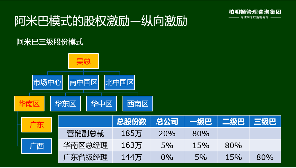 张三、李四、王五是同一级别的三个销售区域经理,公司在进行股权激励时,大家都拿到了一样份额的股份期权,但是折算到各巴去,由于每个销售区域的资产或估值都不相等,因此每个人占各自所在区域巴的股份也就不同了。这是原始的公平。3年以后,每个区域的经营状况肯定会发生变化,从而导致每个区域巴的资产或估值相对初始时或增或减,或多增或少增。行权期到了,大家都需要有条件地购入当初承诺的股份配额,但是需要根据各区域巴现有的资产或估值来计算。如果你的区域增长较多,获得的就不止当初的股份配额,反之则少。具体操作方法详见“横向激励”。