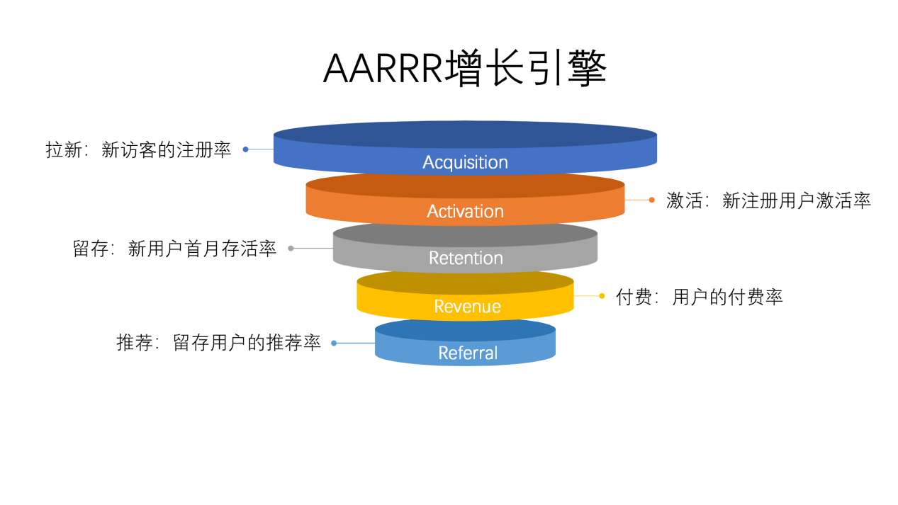 AARRR具体是指以下五个单词的缩写,分别对应用户生命周期中的5个阶段。