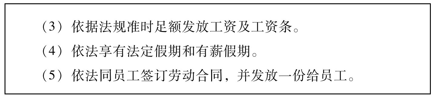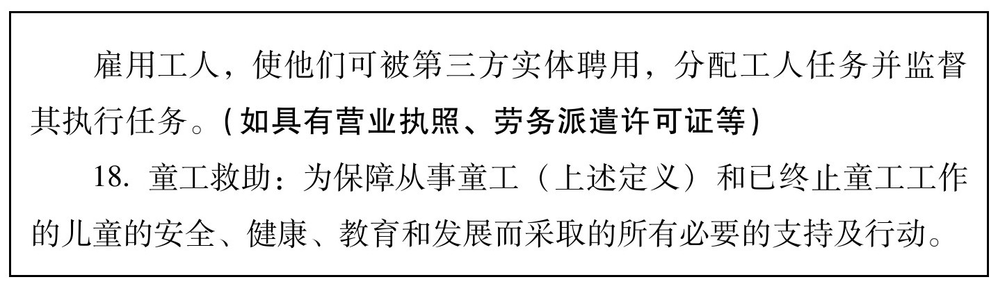 4.本标准目的在于提供一个基于联合国人权宣言,国际劳工组织(ILO)和其他国际人权惯例,劳动定额标准以及国家法律的标准,授权并保护所有在公司控制和影响范围内的生产或服务人员,包括公司自己及其供应商、分包商、分包方雇用的员工和家庭工人。
