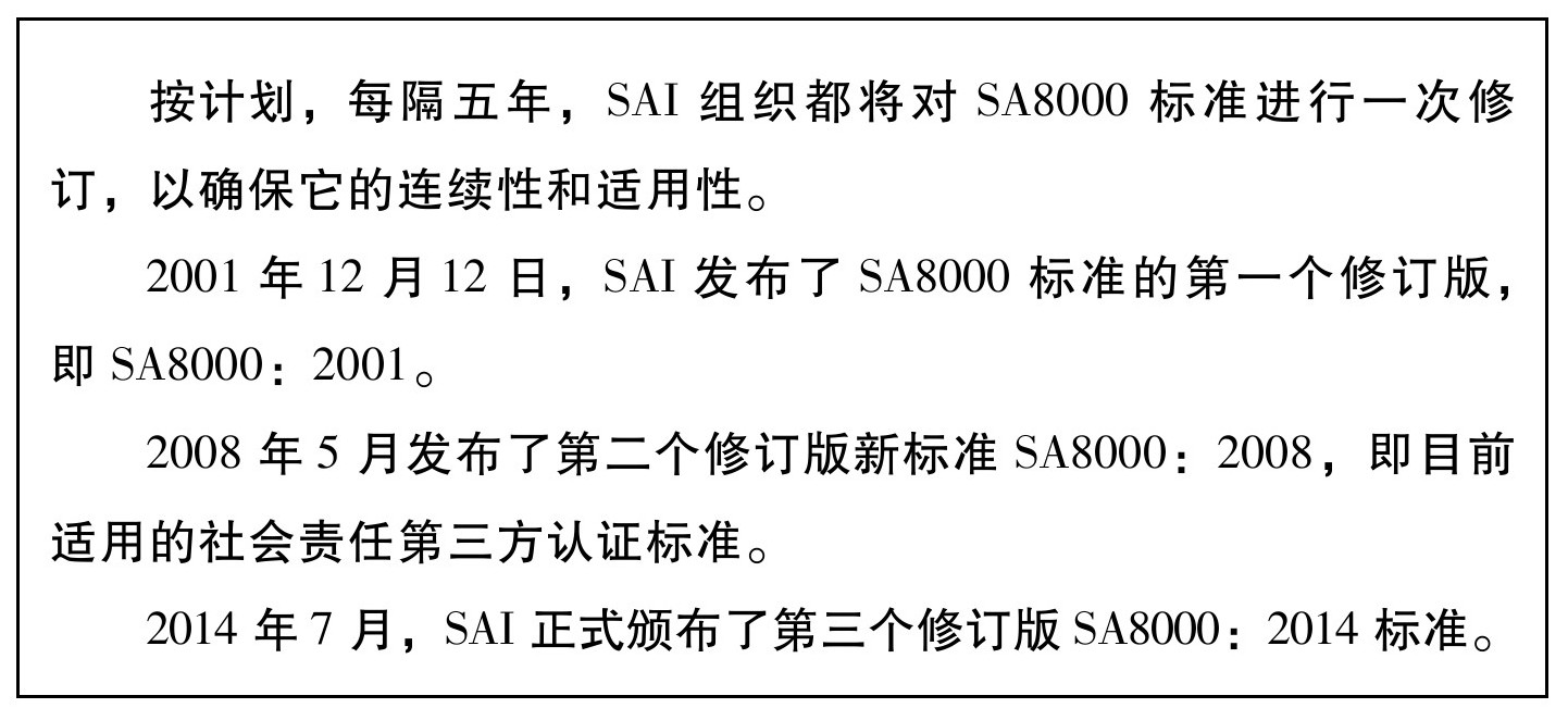 2.按计划,每隔五年,SAI组织都将对SA8000标准进行一次修订,以确保它的连续性和适用性。