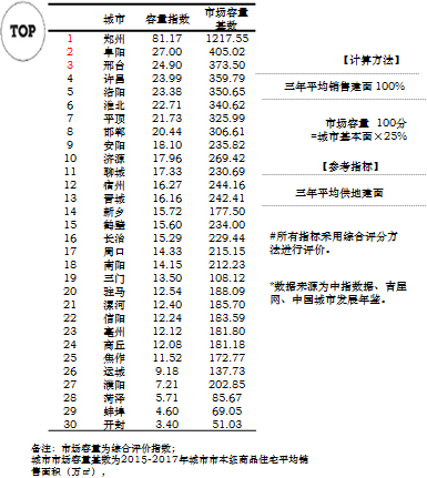 中原城市群城市市场容量基数均值为240万㎡ 。市场容量及安全指数TOP3的城市为:郑州、阜阳、邢台。