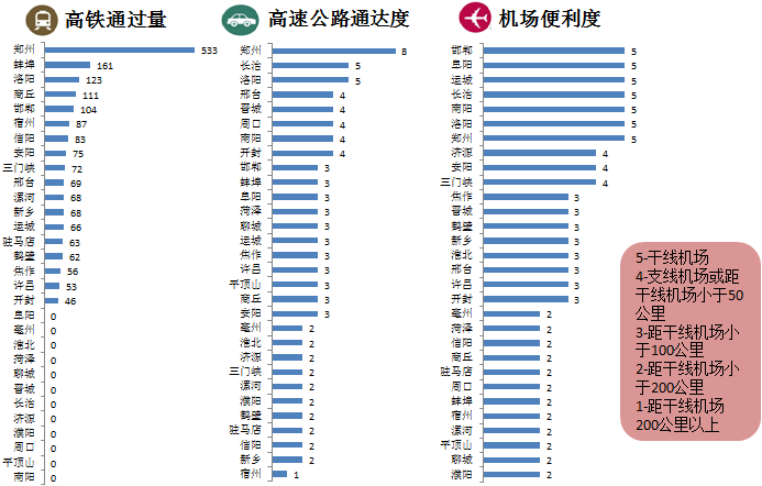 当前郑州已经开通京广、郑西和郑徐高铁,经过郑州的高铁车次533趟,通过高铁能通达的城市数超过120个,未来,郑万、郑合、郑太和郑济4条高铁线路也将陆续建设开通,“米字型”高铁网络的建成将使郑州到合肥、济南、太原、徐州等城市的时间缩短至2小时以内。同时郑州航空港区是集航空、高铁、城际铁路、地铁、高速公路于一体的综合枢纽。