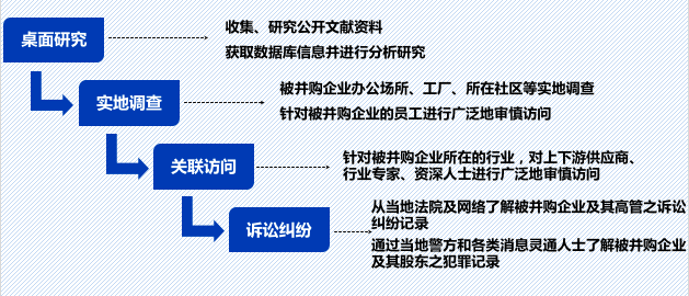 从最常规的角度,一个简化的第三方不公开尽职调查通常按照“桌面研究、实地调查、关联访问、诉讼纠纷查询”四大步骤来具体操作。如图7-1所示。