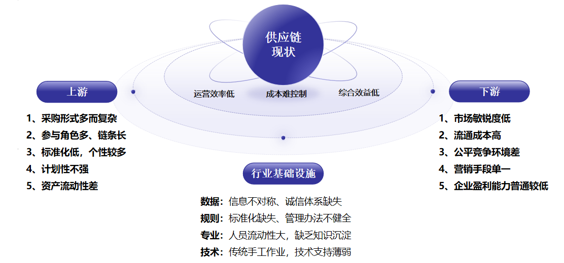 具体来看,上游采购形式复杂,参与角色多而复杂,标准化程度低,计划性不强,资产流动性差,资金流受限。
