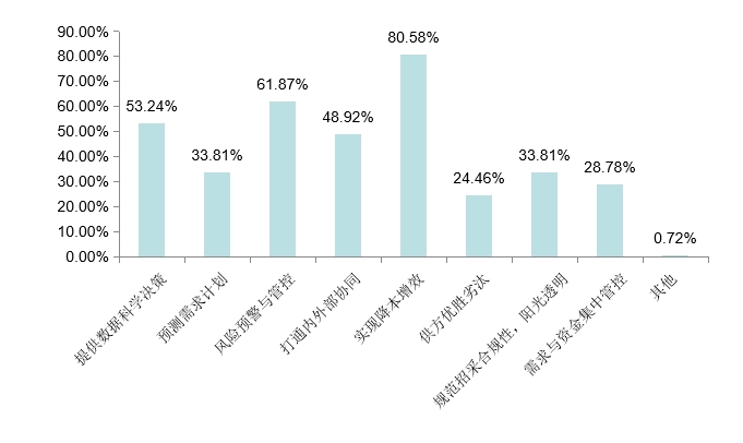 在135家企业的供应链转型难关痛调研中,降本增效的诉求占比达到80.58%,风险预警与管控占比达到61.87%,提供数据科学决策占比达到53.24%。通过数据对比,在行业利润不断下滑的大背景之下,改变企业管理粗放,依托供应链管理进一步降本增效,促进企业有质量的增长,成为了企业落实供应链转型的核心诉求,如图1-1-3所示。