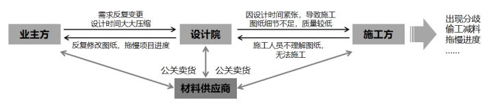 这个过程中的拉扯,三方之间相互责任推诿,导致出现分歧、偷工减料、拖慢进度等。同时,作为材料供应商想要与项目建立供应关系,营销成本却不断增加,这些公关费用最后同样转嫁到了材料供应的交易价格之中。