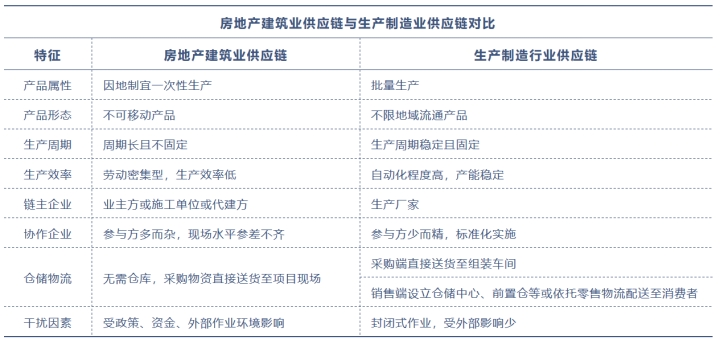 根据上表的对比,单纯从供应链的规划建设视角来看,应该具备产、销、服一体化的后勤保障职能,但建筑空间属于不动产,无法实现空间移动,因此在房地产建筑空间落成后的销售、服务维度并不存在所谓的成品库存、物流配送、服务的概念,在后端交付上供应链管理是缺失的。因此,我们所谈及的房地产、建筑业的供应商属于生产供应链。