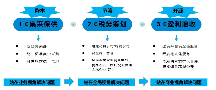 供应链的管理不再满足于企业自身的价值创造,而是开始社会化运营,将企业内部的供应链体系开放出来,面向行业中小企业输出企业的核心能力。进入3.0阶段,原有的材料公司或物流公司已经不再是单纯为了进行税务筹划而存在,完全独立运营,从组织架构体系都会全面升级,在第8章内容中会重点讲组织体系的搭建。