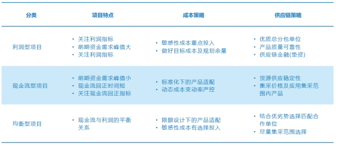 现金流型项目:这是典型的快开快建项目,关注现金流回正指标。这一类项目前期资金需求峰值小,现金流回正时间短。在成本投入上,采用标准化的产品,快速做到适配,这一般也是企业的成熟产品体系,供应链合作伙伴较为成熟,会针对动态成本变动率进行严控。基于这一类项目的交付,在供应链的策略上,强调物资供应链的稳定性,尽量选用集采范围的产品及应用交付。