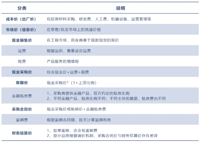 根据供应链从端到端,我把每个流通环节都有不同的价格分类与税费分类,我将工程报价体系拆分为7种价格与4种费用,简称为“7+4”工程价格体系。其中,价格类型分为:成本价(出厂价)、市场价(信息价)、销售价(现金价)、采购现金价、账期价、采购合同价、财务结算价;费用类型分为:运费、税费、金融贴息费、逾期费。如下表1-3-2所示。