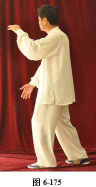 掤:右腰上提,右脚向前迈步,重心渐渐移至中间,成右弓步; 腰继续上提,右小臂同时向右上前方打掤,右掤手高与膻中穴平。左手掌心向下置于左胯旁,意念领腰继续上提,右手随之向右上撩掤,左掌跟随向上,当掤至略高于肩时,两掌翻转掌心斜相对(见图6-174至6-189)。
