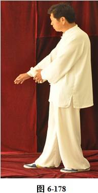 注意:身体左右转动时,要以腰为轴,内劲带动,身体保持中正、松肩、松胯、松膝。这套拳自始至终对身形的要求都是一致的, 动作要柔缓,速度要均匀,手脚的动作配合更要协调一致。弓步时小腿要垂直,膝盖以不超过脚趾与脚掌相连的指节为宜。