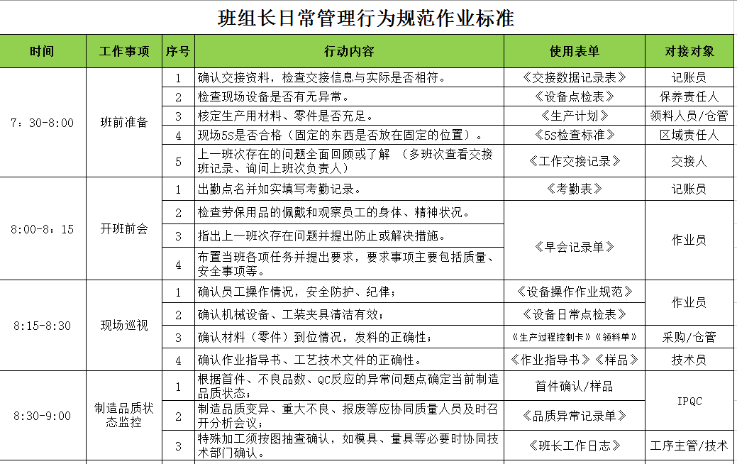 一份标准的班组长的标准作业有着至少5项要素: