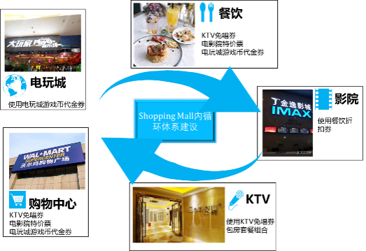 商圈内存在多种业态,多种消费场景,必须将这些消费场景进行串联,整合资源内循环,通过渠道及品牌活动来稳固产品在shopping mall各个场景的流通。如图9-11所示。