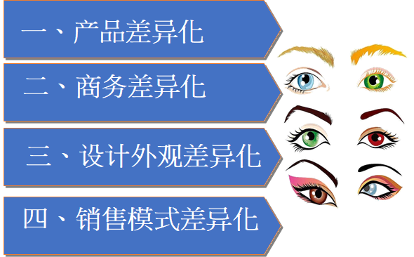 世界不缺乏美,只是缺乏一双发现美的眼睛,寻找差异化有四个途径:产品差异化、商务差异化、设计外观差异化、销售模式差异化,如图9-2所示。