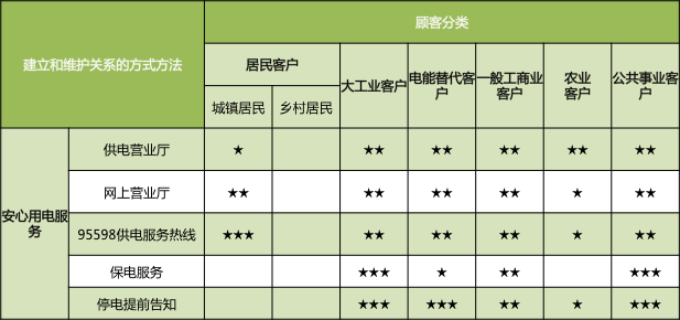 安心用电服务主要以网上营业厅、95598供电服务热线、保电服务、停电提前告知等方式,提高客户安心用电度。