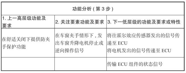 功能分析就是识别各个结构的功能及功能要求,比如关注焦点车窗升降器电子单元的功能是:在车窗夹手的情况下,发出车窗升降电机停止和逆向操作的信号。它的系统是车窗升降系统,功能是在舒适关闭模式下提供防夹手保护功能,它的一级部件是连接器和其他内部接口。如图5-6、表5-3所示。