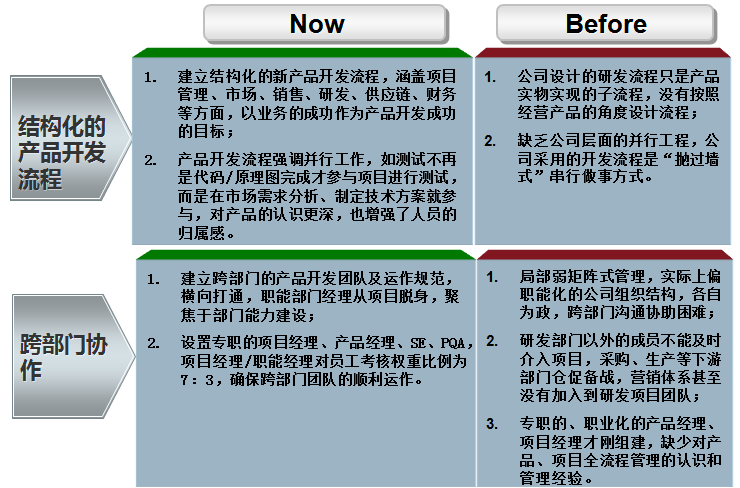 咨询项目运作一年时间后,由金卡智能公司自身进行了IPD咨询项目效果总结,取得的定性效果是: