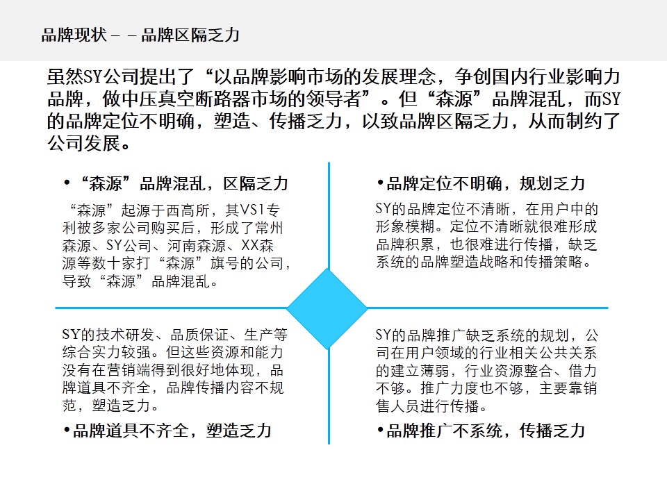 虽然SY公司提出了“以品牌影响市场的发展理念,争创国内行业影响力品牌,做中压真空断路器市场的领导者”的目标,但“森源”品牌混乱,而SY公司的品牌定位不明确,塑造、传播乏力,以致品牌区隔乏力,从而制约了发展。具体表现在以下几个方面: