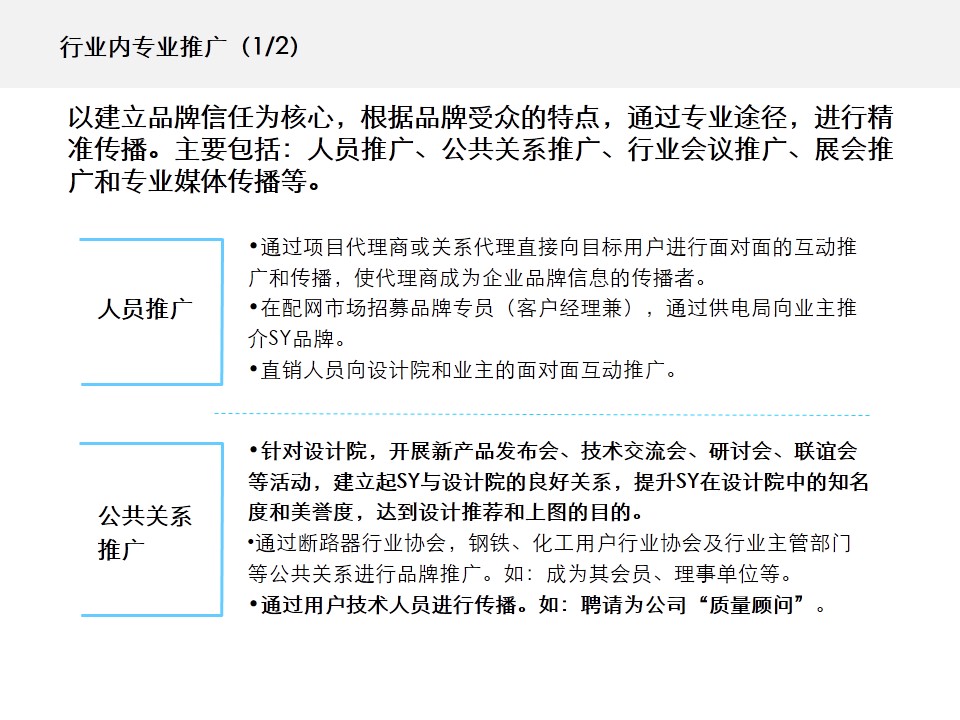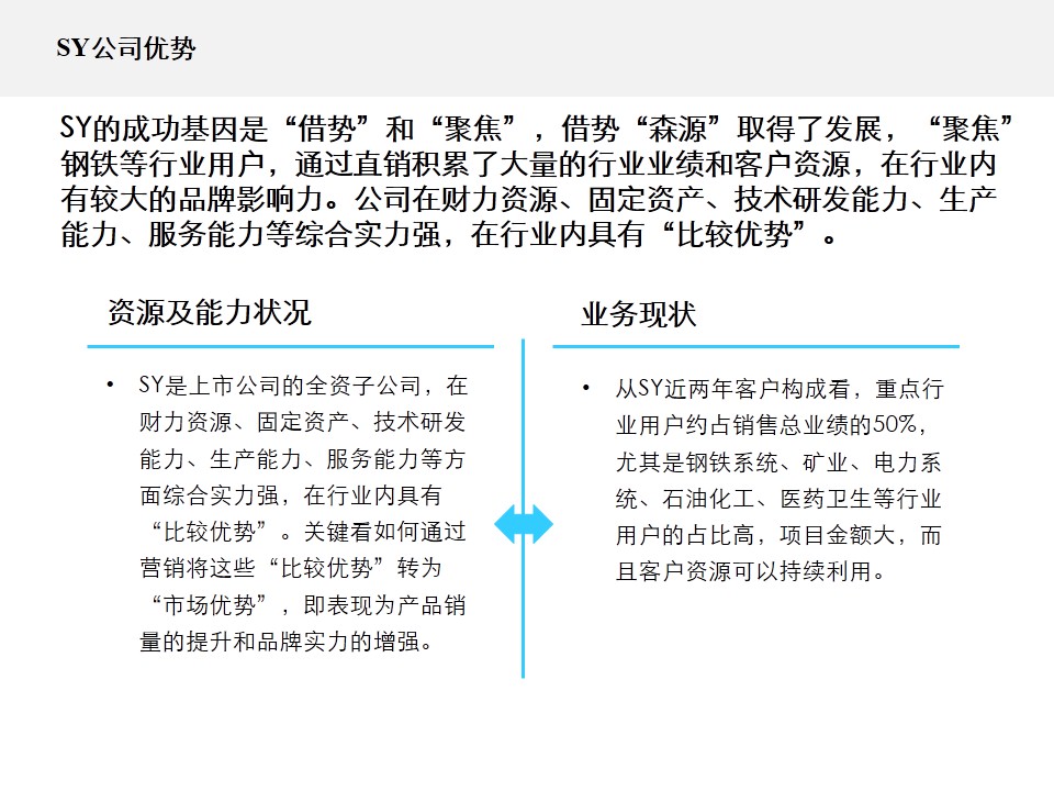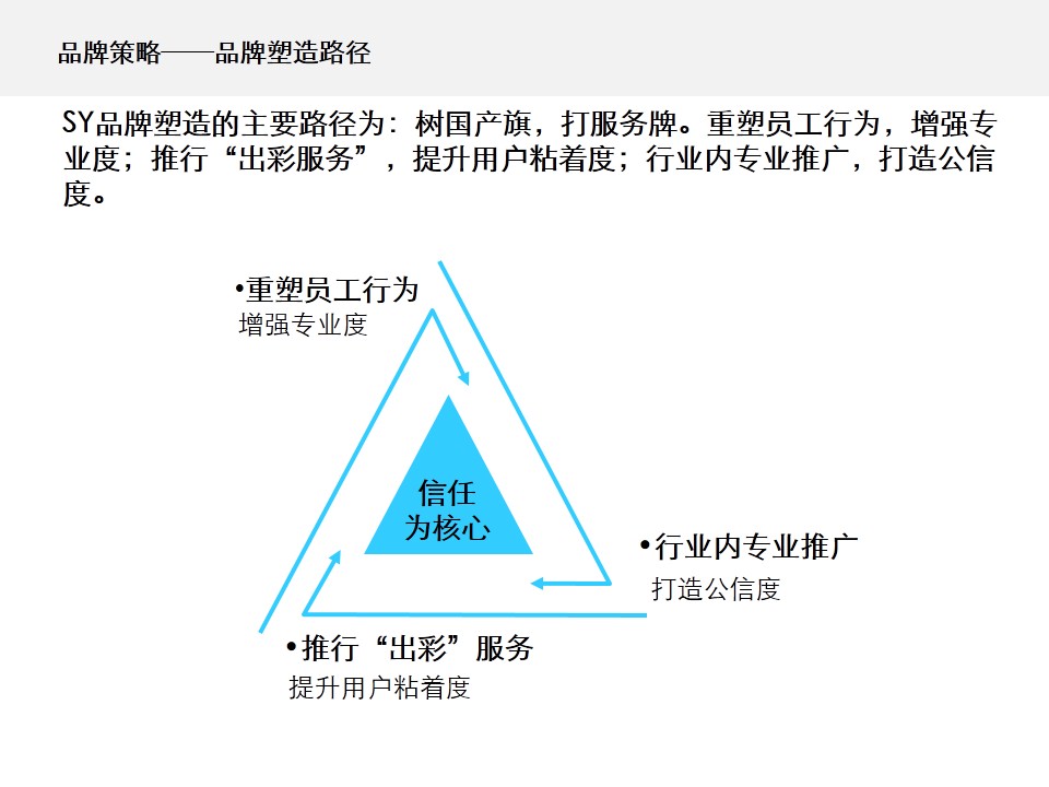(2)品牌传播不聚向,道具乏力。SY公司的品牌推广缺乏系统的规划,公司在用户行业建立的相关公共关系薄弱,行业资源整合、借力不够,推广力度也不够,主要靠销售人员进行传播。SY公司的技术研发、品质保证、生产等综合实力较强,但这些资源和能力没有在营销端得到很好的体现,品牌道具不齐全,品牌传播内容不规范,塑造乏力。