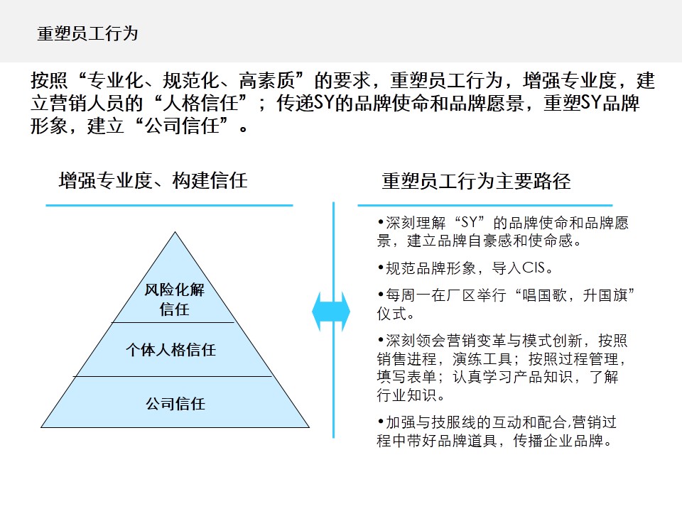 SY公司应运用工业品营销品牌提炼与塑造工具,即品牌提炼六要素、品牌塑造两力模型,定制并优化SY的品牌策略,主要内容如下: