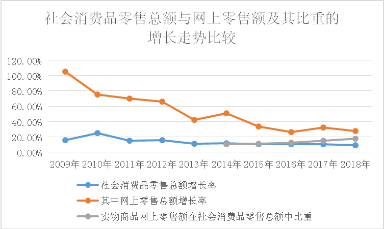 如果再将数据进一步聚焦于线下社会消费品零售中的实体零售业在2018年前三季度的增长,就会进一步发现,同一阶段28%的网上零售额增幅将会达到线下实体零售业的436%(2018年前三季度,超市、百货店、专业店等限额以上单位实体零售业态零售额总体同比增长6.6%),这个数据差相对于前面的那个数据更为惊人。