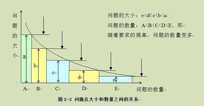 从图3-2所示的数学模型中可以清楚地发现,每当我们提高要求或者提升我们发现问题的能力的时候,我们将能够发现越来越多的问题点。这也就是提案活动可以长期推进,并且不用担心数量会越来越少的一个理论依据。