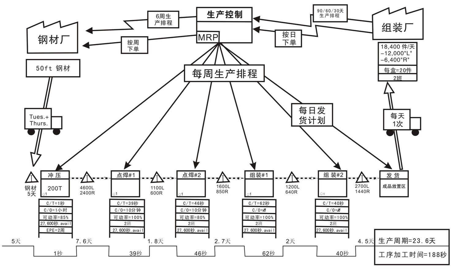 价值流图的第一本书是美国学者所编写的《价值流图析》,里面采用了阿克米冲压工厂作为例子来讲述价值图的绘制,如图2-3所示。