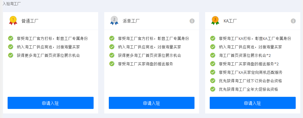 第九种营销工具:淘工厂。淘工厂分三种类型,这三个类型对应的权益不一样。自己依据条件选择。如图9-22所示。
