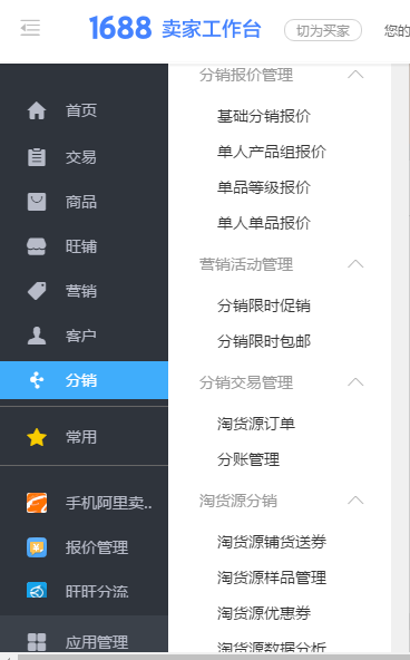 2)路径是:我的阿里后台——1688卖家工作台——分销——淘货源分销。