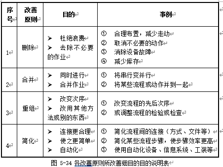 在第二阶段分析的基础上,我们就要对存在的问题点或者可改善点制定相应的新的工作方法。其常用的方法就是采用ECRS(删除、合并、重组、简化)原则进行改善。这里要特别注意的是,在改善时,一定要注意按照删除、合并、重组、简化的顺序进行,不可打乱顺序。各问题点所对应的改善方法如图5-33所示。