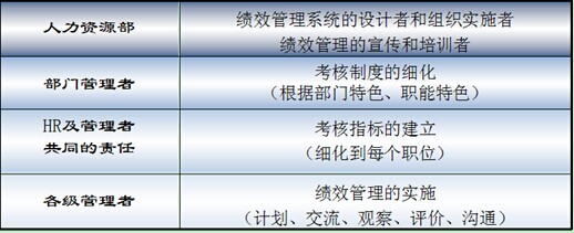 人力资源部门和管理者共同的责任是考核指标的建立。人力资源部门作为专业机构,支持业务部门对公司的战略目标进行分解并细化到每个部门和每个职位,构成他们可执行的考核指标。