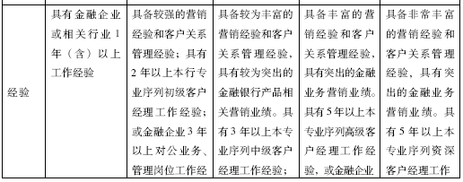 根据客户经理的个人工作能力、工作业绩以及所负责客户综合贡献额等,将银行的客户经理划分为:资深客户经理、高级客户经理(二级、一级)、客户经理(二级、一级)和助理客户经理四等六级,其他营销人员为见习客户经理。其中资深客户经理和高级客户经理按总行、省行规定执行,由市分行公开招聘和聘任,客户经理和助理客户经理由各支行组织招聘并报市分行审批后聘任。