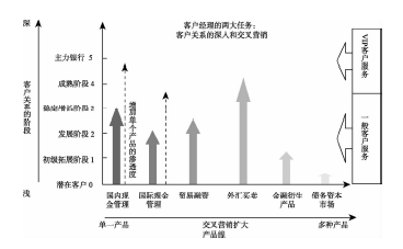 (4)增加客户价值阶段:这是目前最先进的理念,是指通过向客户提供产品和服务,使客户价值增加,让客户享受增值服务,体会到物超所值。对银行来说,就是通过提供高专业水准的服务,使客户资产价值增加、风险降低、营运效率提高,使股东回报最大化。