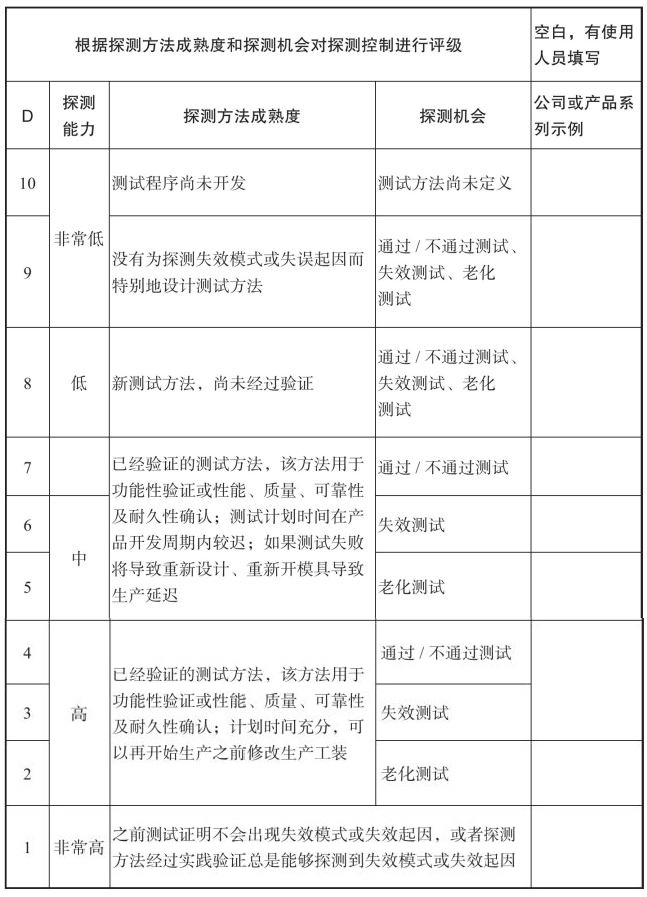 探测度是指现有的测试或试验、使用的方式下发现失效的机会。如表3-9所示。