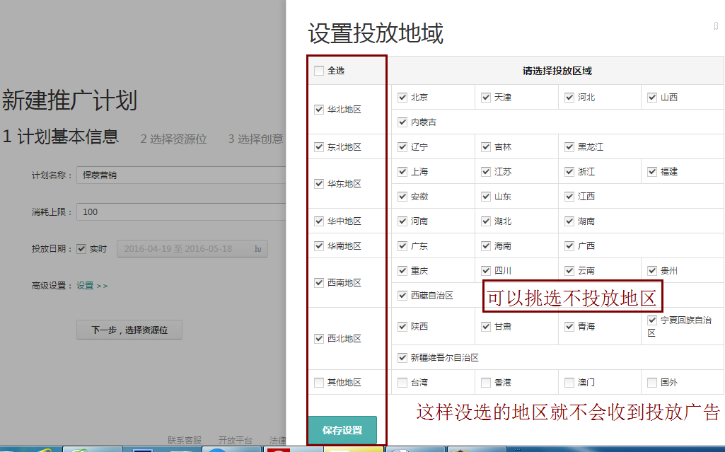 第一步,打开时如果没有设置计划,就要点击新建,然后新创建计划。前期金额不要设置太多,100元即可,计划名称可以自己设置,如按日期、按公司等。投放区域可以选择,一般像香港、台湾等地区可能就不设置(当然也要看行业而言)。当然也可以单独挑选一些区域,如宁夏、青海。