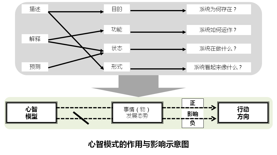 从三种作用机理来看,心智模式其实是一种机制。人们通过心智模式,能够以一种概论来描述系统的存在目的和形式,解释系统的功能和观察系统的状态,以及预测未来的系统状态。