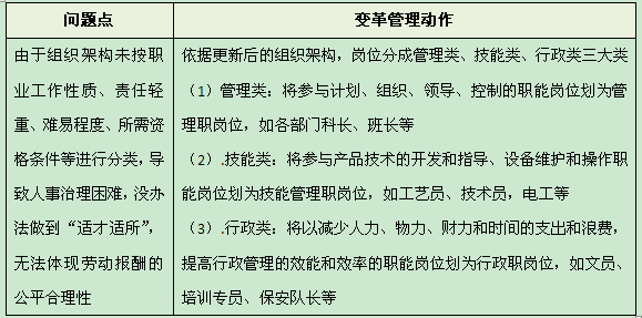 :针对这些问题,项目组推出的变革动作是:根据更新后的组织架构,岗位分成管理类、技能类、行政类三大类。将参与计划、组织、领导、控制的职能岗位划为管理类,如各部门科长、班长以及部长。
