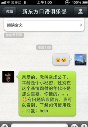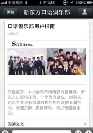做好导航的好处是,让用户在看完用户指南后第一时间就喜欢上我们的微信,觉得内容都很实用,例如:回复:1经典电影推荐;2好听的英文歌曲推荐;3经典美剧推荐;4怎么利用网络学习英文等等,给微信粉丝留下一个很好的印象,如果他们喜欢上了内容,就会很自然地期待每天发的内容了。例如:
