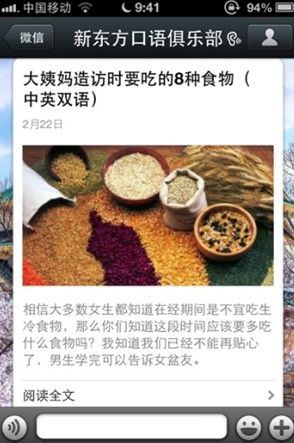 周一到周四会直接推送一分钟的《口语微课堂》。这个节目是由口语团队老师真人录制的,给大家讲解一些口语常用表达,周五偶尔搞搞互动,发发软广告,但是一定不能每天发广告,发一次广告就是对你微信粉丝的一次小伤害,广告多了,大家就烦了,会取消关注。所以广告一定要控制住,埋头做好内容。周六日我们会精选一些能引发朋友圈转发的双语趣闻,微信平台想要做大,一定是靠朋友圈的转发,从而用内容吸引更多的粉丝,有时一篇好的内容可以在朋友圈转发上2000+次。