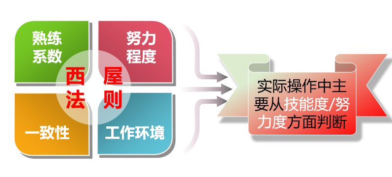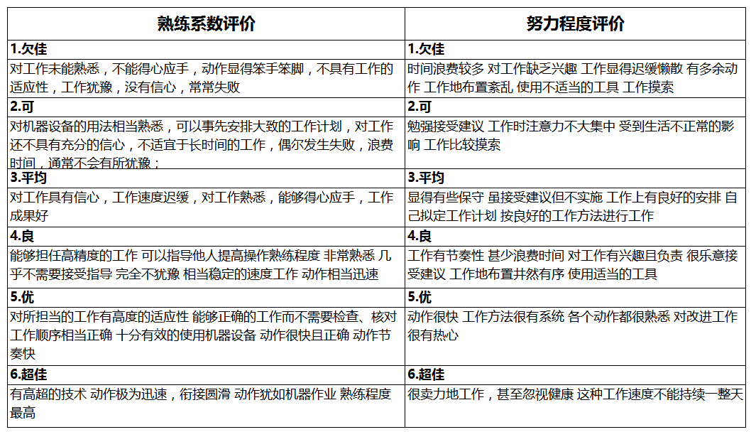 首先要找出影响速度的四大因素:熟练程度、努力程度、工作环境和一致性,每个要素由高到低分成几个等级,各等级给予一定的等级系数。