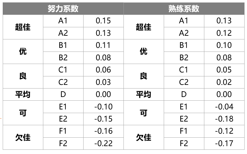 表1-1、表1-2为熟练系数和努力程度评价细则和数据。