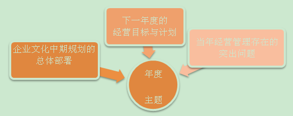 企业文化建设年度主题的确定依据:要遵循三结合原则,既要依据企业文化中期规划的总体部署,又要依据下一年度的经营目标和计划,还要依据当年经营管理中存在的突出问题进行分析和诊断,以问题为导向,以经营计划达成为目标,从而筛选出年度主题。