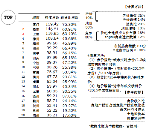市场热度指数重点考察市场房价、地价现状及涨幅情况,进驻潜力和市场竞争热度,来分析目前的市场热度。海峡西岸城市群地货比指数中位值为43%,整体来看市场机会适中,可适当进入。热度指数TOP3城市为:厦门、揭阳及上饶。
